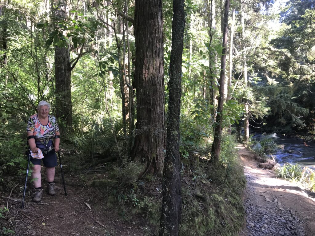 Daarna lopen we langs de rivier Hatea verder stroomafwaarts. Het eerste deel was het moeilijks voor Ineke. Met grote stenen en wortels in het pad. Eén stuk van het pad was weggeslagen.