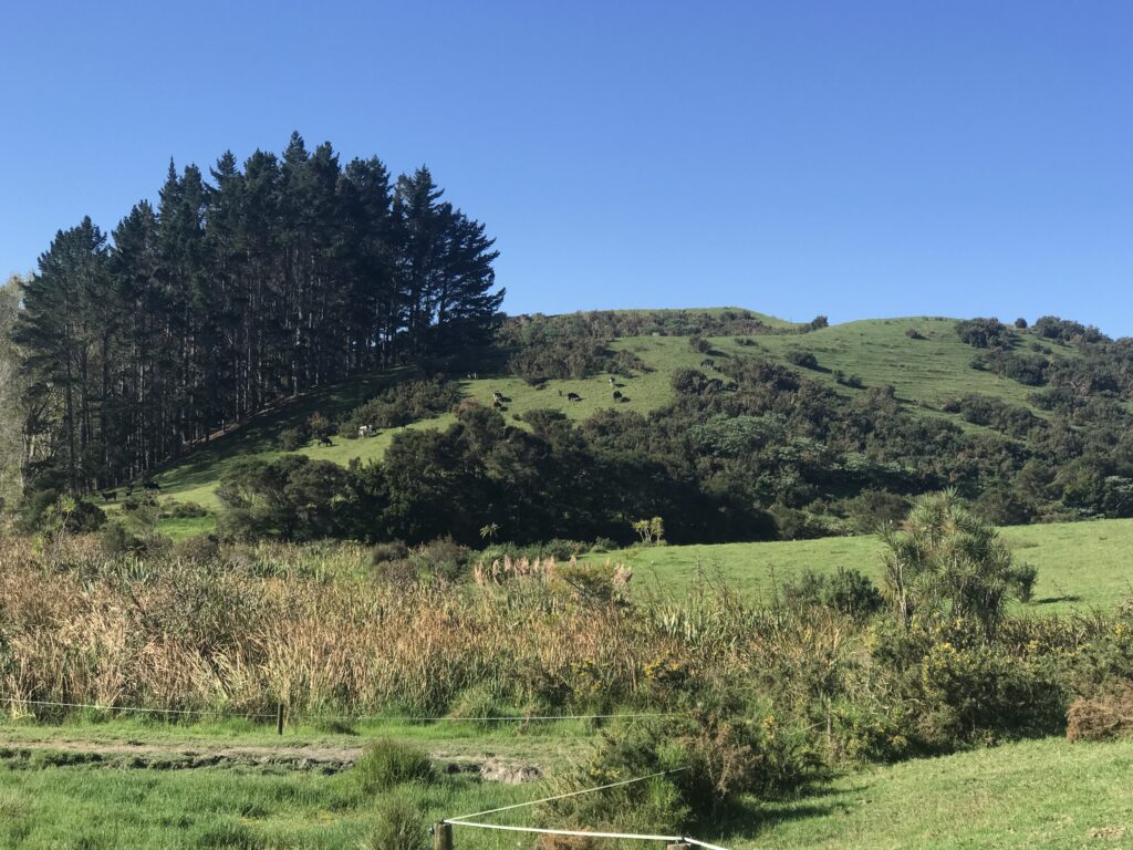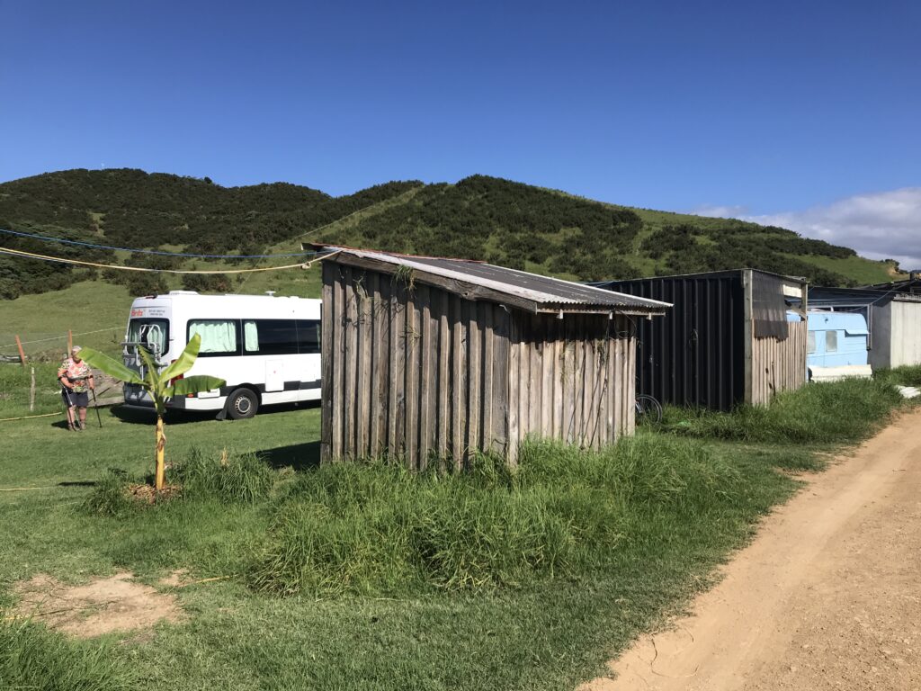 We gaan eerst naar de dichtstbijzijnde supermarkt, de Countdown in Tikipunga om onze levensmiddelen op peil te brengen. Daarna gaat Ineke bekijken hoe onze route verder loopt en of er een mooie lunch plek langs deze route te vinden is. Ze vindt een geocache bij een museum, waar je kunt parkeren. Via wat kleine weggetjes rijden we naar de SH1 en rijden naar de parkeerplaats van het Jack Morgan Museum. Daar gaan we lunchen en Johan lost de puzzel op om de cache te kunnen openen. Wat is die jongen toch slim! Dan blijkt dat we 8 km te ver zijn gereden. Ineke is toch niet zo slim! We rijden 8 km terug over de SH1 om de kleine afslag naar de Russel road te nemen. De weg naar onze campsite voor vannacht: The Farm, een working farm aan de Russel road (nr 3632). De Russel road gaat door een prachtig landschap maar is een moeilijke weg om te rijden. Omhoog en naar beneden en dat dan continue met bochten naar links en naar rechts. We hebben vandaag weer eens een alternatieve camping, een soort leefgemeenschap waar ook Yoga cursussen worden gegeven aan mensen, die yoga cursussen willen geven en waar allerlei mensen wonen, op zoek naar wijsheid en zichzelf en waar je ook kunt kamperen.