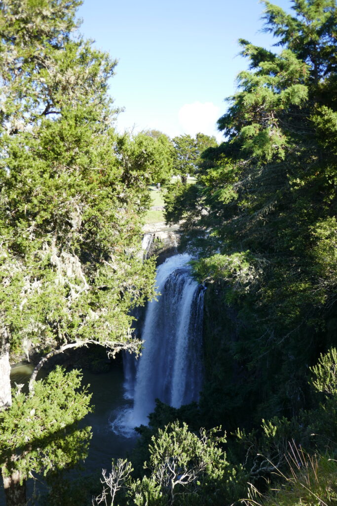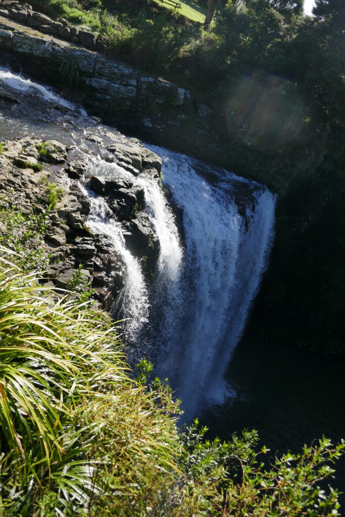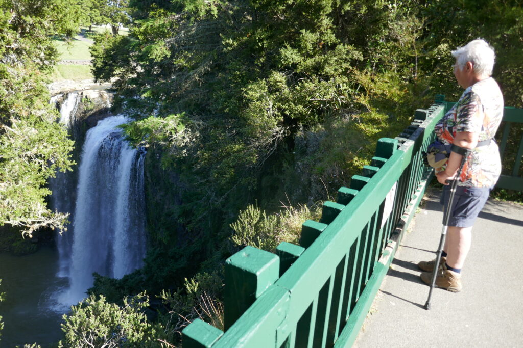 We beginnen de wandeling bij het viewpoint boven de waterval. Die is eigenlijk gesloten omdat men net de railing heeft geverfd, maar we kruipen onder het afzetlint door, om een blik op te werpen op de waterval. Een mooie waterval die goed gevuld is met water vanwege de regens van de afgelopen tijd. Dan lopen we over een levensgevaarlijk bruggetje naar de overkant. Kijk zelf maar in google streetview: brug over de Hatea River. Een brug zonder leuningen en slechts enkele meters verwijdert van de bovenkant van de waterval. Ineke verbaast zich dat dat kan en mag. Johan had niet eens door dat we zo dicht bij de waterval liepen. Maar we zijn veilig aan de overkant gekomen. Daar was een beter viewpoint. De schilder, die nu bezig was met dit viewpoint, gaf duidelijk aan waar nog niet geverfd was en we rustig konden kijken.